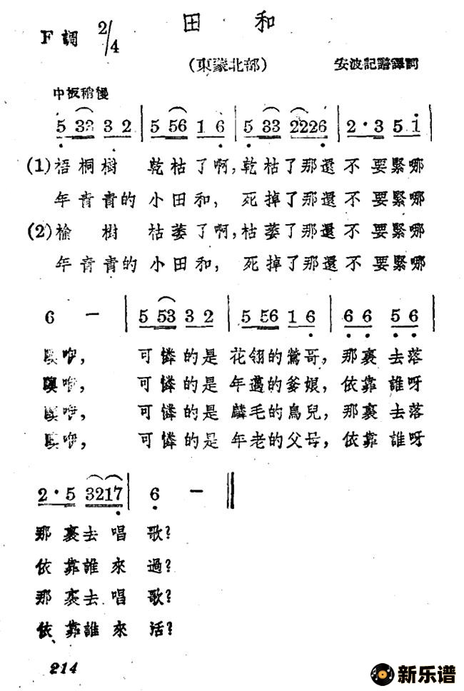 蒙古族民歌、安波记谱译词演唱的田和歌词,田和简谱.