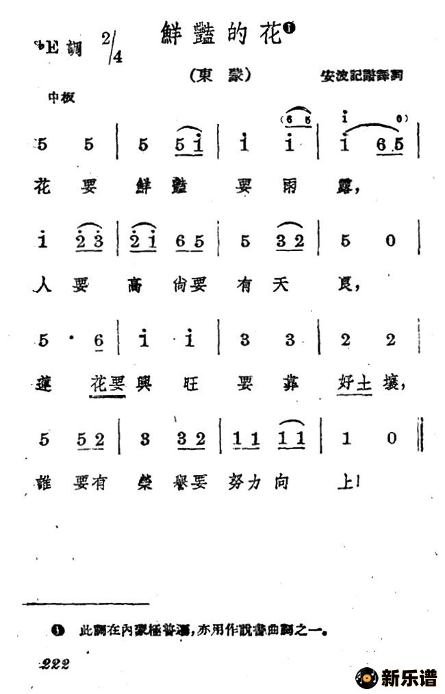 《鲜艳的花》简谱 蒙古族民歌、安波记谱译词