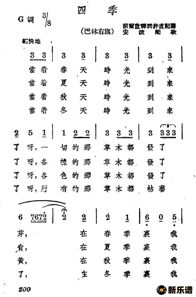 演唱的四季(蒙古族民歌、安波配歌)歌词,四季(蒙古族民歌、安波配歌)简谱.
