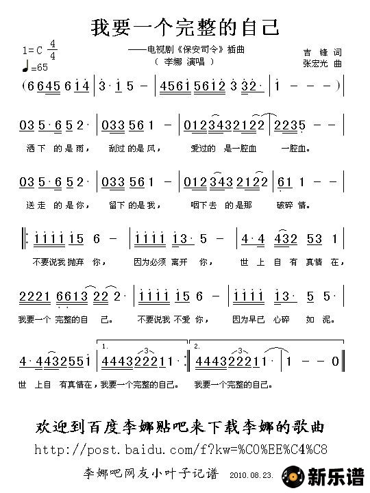 李娜演唱的我要一个完整的自己(电视剧《保安司令》插曲)歌词,我要一个完整的自己(电视剧《保安司令》插曲)简谱.