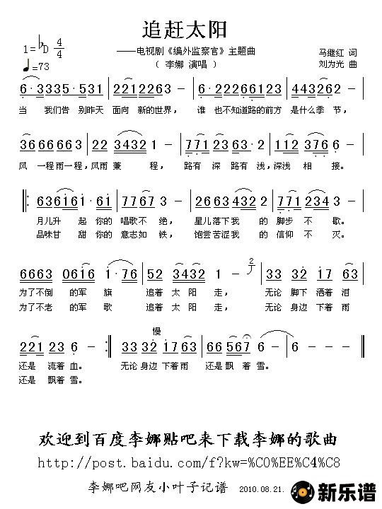 李娜演唱的追赶太阳(电影剧《编外监察官》主题曲)歌词,追赶太阳(电影剧《编外监察官》主题曲)简谱.