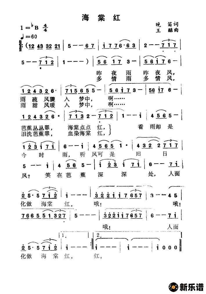 《海棠红》简谱 -小叶子制谱