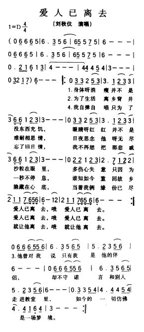 刘秋仪演唱的爱人已离去歌词,爱人已离去简谱.