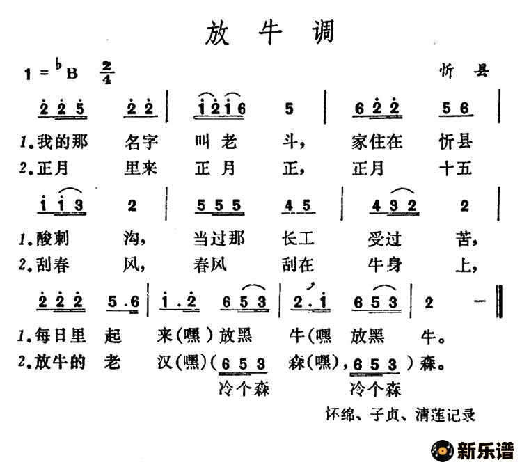 演唱的放牛调(山西忻县山歌)歌词,放牛调(山西忻县山歌)简谱.