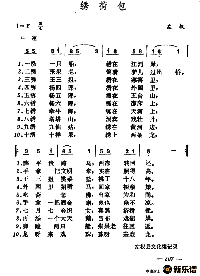 演唱的绣荷包(山西左权小花戏)歌词,绣荷包(山西左权小花戏)简谱.