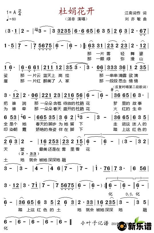 汤非演唱的杜娟花开歌词,杜娟花开简谱.