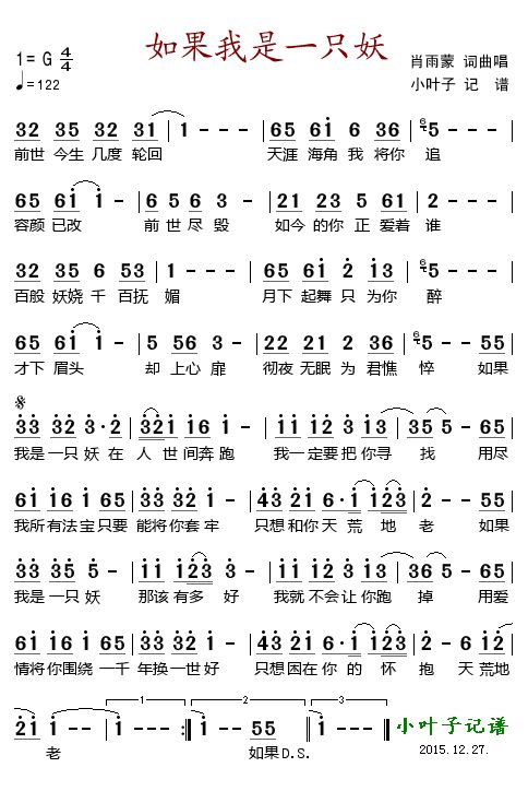 《如果我是一只妖》简谱 肖雨蒙-小叶子制谱