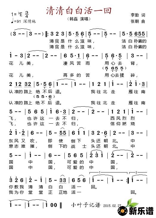 《清清白白活一回》简谱 韩磊-小叶子制谱