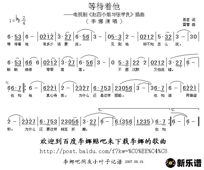 《等待着他(电视剧《赵四小姐与张学良》插曲)》简谱 李娜-小叶子制谱