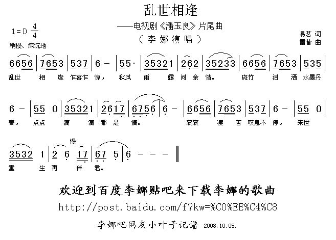 李娜演唱的乱世相逢(电视剧《潘玉良》片尾曲)歌词,乱世相逢(电视剧《潘玉良》片尾曲)简谱.
