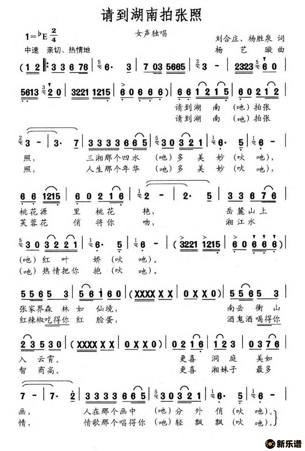 杨艺璇演唱的请到湖南拍张照歌词,请到湖南拍张照简谱.