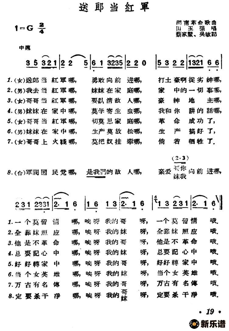 演唱的送郎当红军(湖南革命歌曲)歌词,送郎当红军(湖南革命歌曲)简谱.