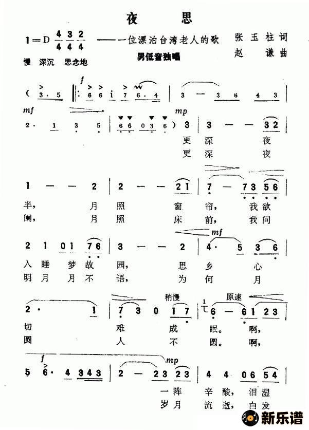 赵谦演唱的夜思(一位漂泊台湾老人的歌)歌词,夜思(一位漂泊台湾老人的歌)简谱.