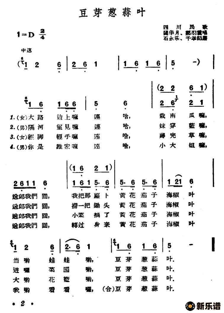演唱的豆芽葱蒜叶(四川民歌)歌词,豆芽葱蒜叶(四川民歌)简谱.