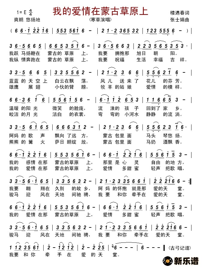 寒草演唱的我的爱情在蒙古草原上歌词,我的爱情在蒙古草原上简谱.