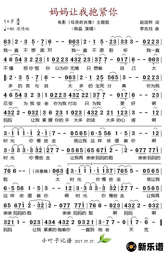《妈妈让我抱紧你(电影《母亲的肖像》主题歌)》简谱 韩磊-小叶子制谱