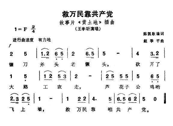 王学圻演唱的救万民靠共产党(故事片《黄土地》插曲)歌词,救万民靠共产党(故事片《黄土地》插曲)简谱.