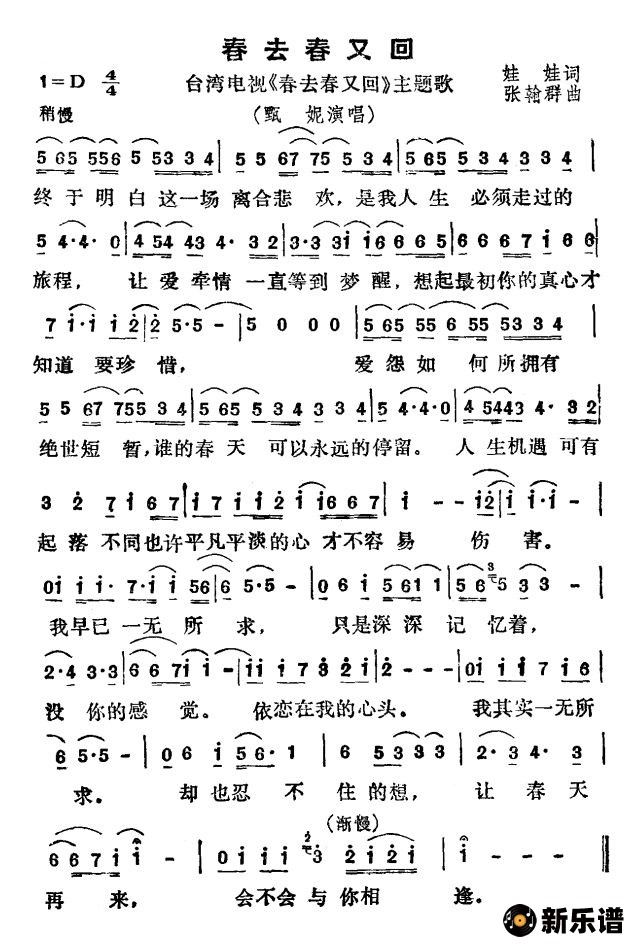 甄妮演唱的春去春又回(台湾电视《春去春又回》主题歌)歌词,春去春又回(台湾电视《春去春又回》主题歌)简谱.