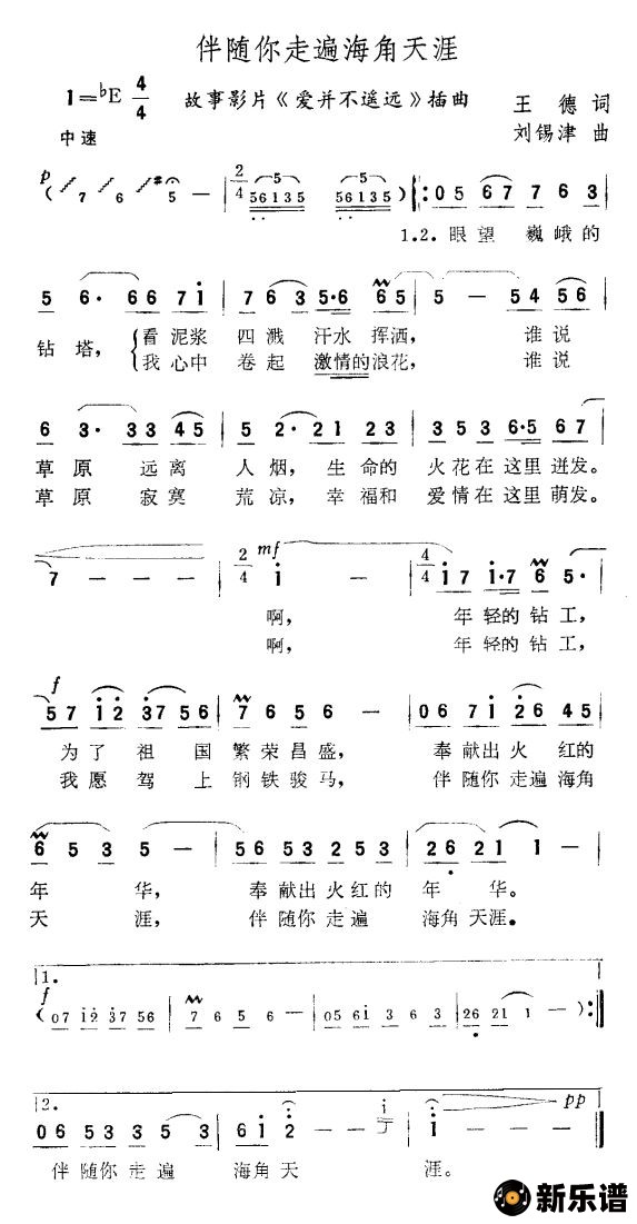 演唱的伴随你走遍海角天涯(故事片《爱并不遥远》插曲)歌词,伴随你走遍海角天涯(故事片《爱并不遥远》插曲)简谱.