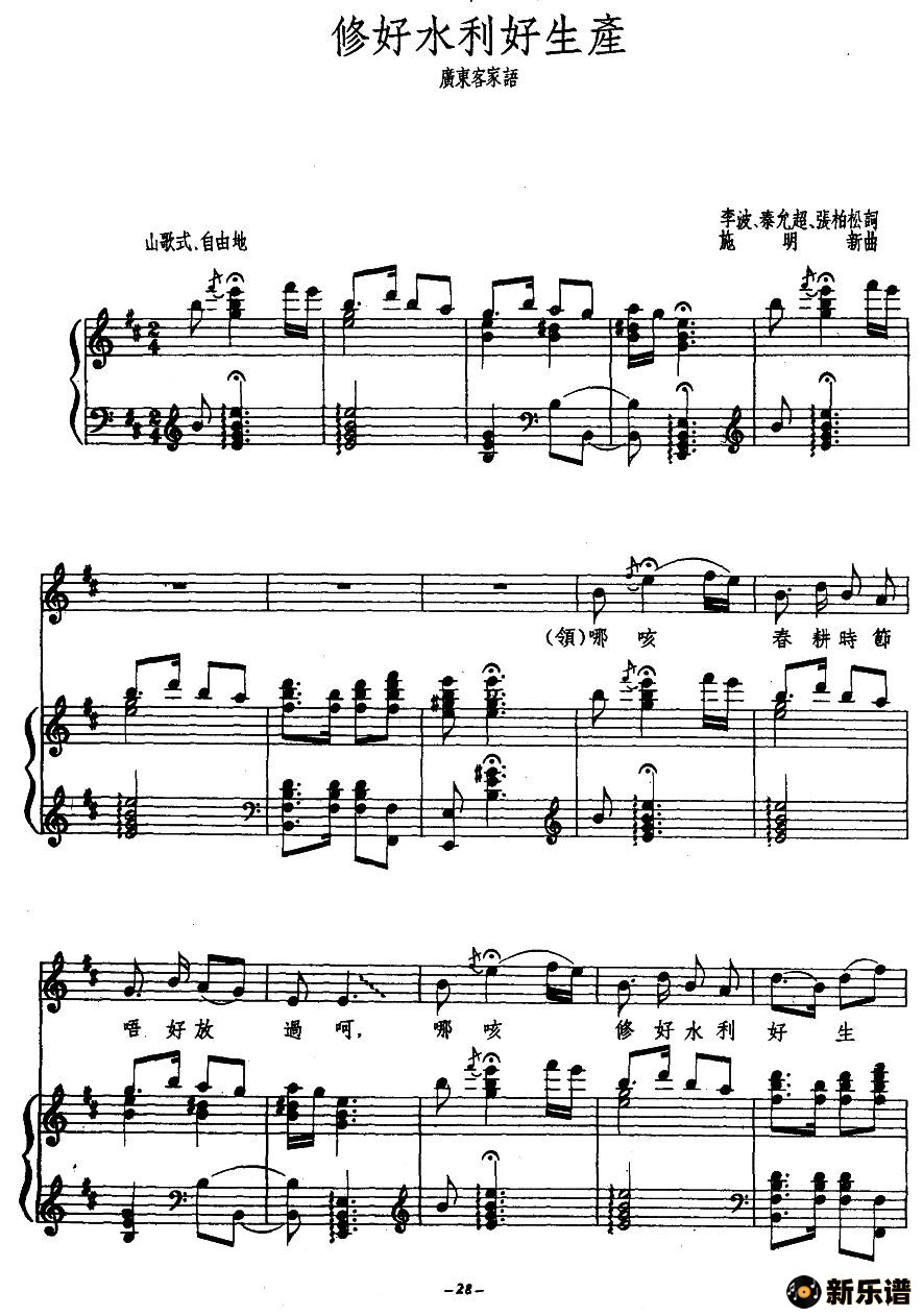 施明新演唱的修好水利好生产 (广东客家方言演唱、正谱)歌词,修好水利好生产 (广东客家方言演唱、正谱)简谱.
