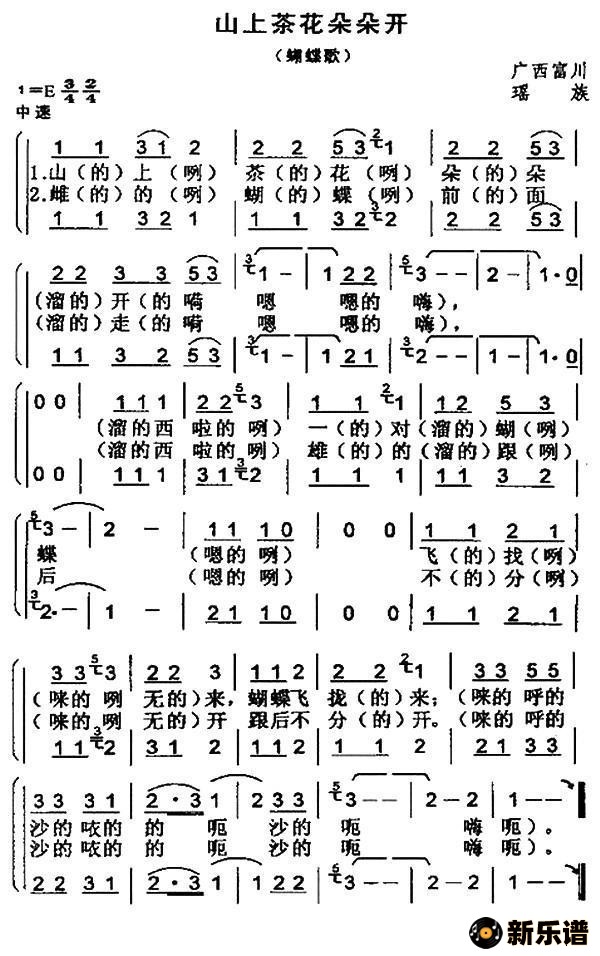 广西富川山歌演唱的山上茶花朵朵开(蝴蝶歌)歌词,山上茶花朵朵开(蝴蝶歌)简谱.