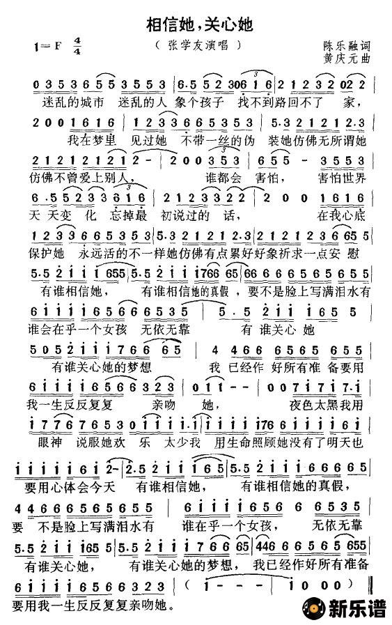 相信她,关心她/张学友 相关曲谱