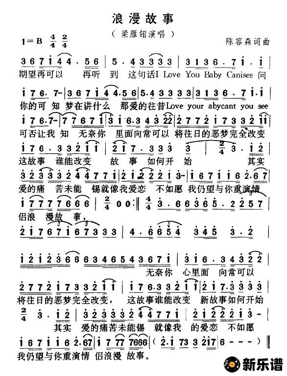 梁雁翎演唱的浪漫故事歌词,浪漫故事简谱.
