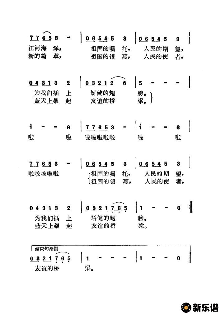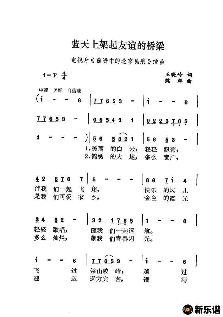蓝天上架起友谊的桥梁(电视片《前进中的北京民航》插曲) 演唱的蓝天上架起友谊的桥梁(电视片《前进中的北京民航》插曲)歌词,蓝天上架起友谊的桥梁(电视片《前进中的北京民航》插曲)简谱. 此简谱由新乐谱会员 小叶子 上传