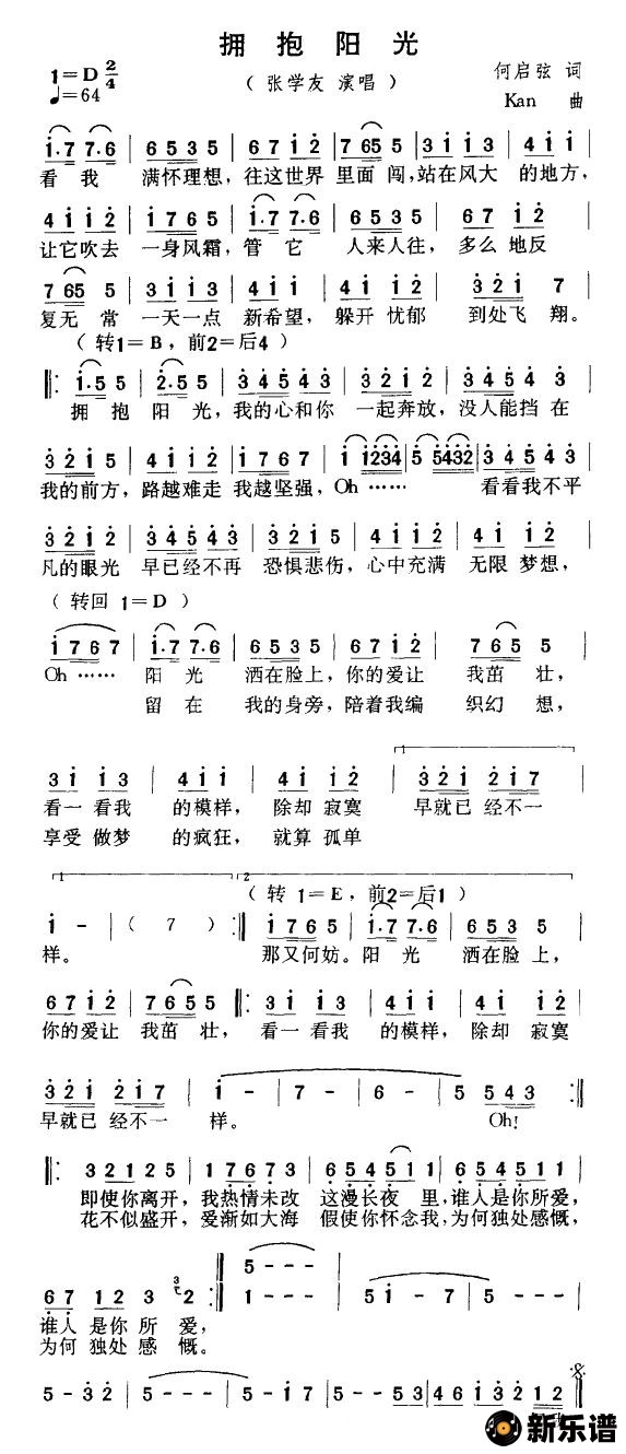 张学友演唱的拥抱阳光歌词,拥抱阳光简谱.