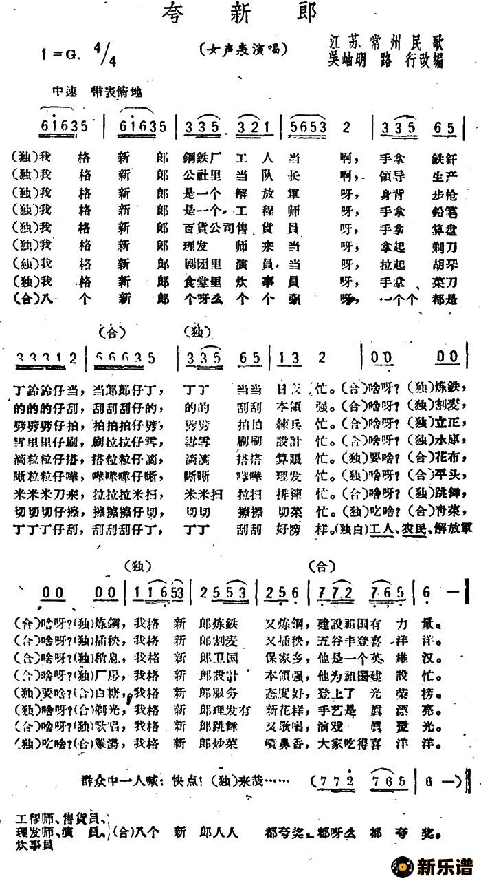 演唱的夸新郎 (江苏常州民歌)歌词,夸新郎 (江苏常州民歌)简谱.