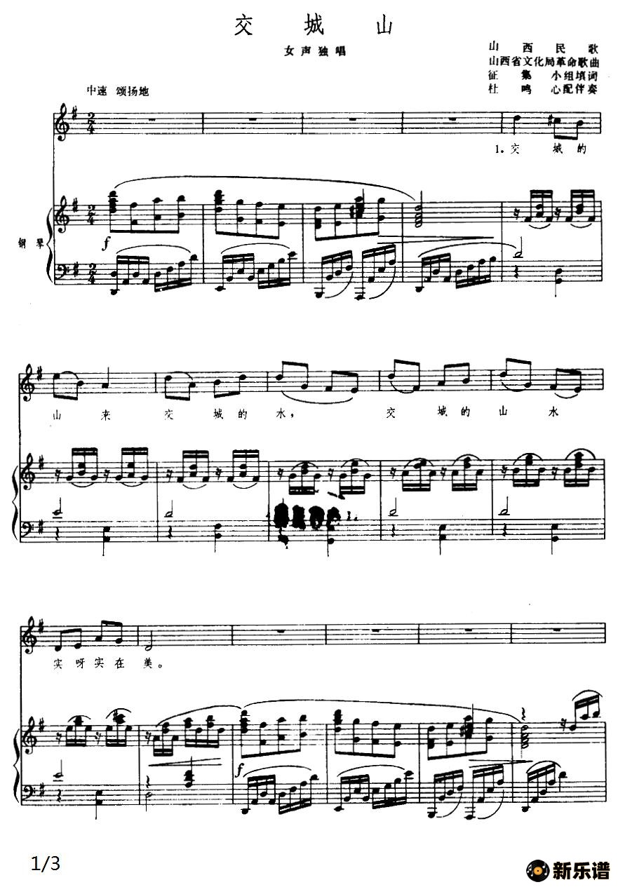 山西民歌、杜鸣心配伴奏演唱的交城山(1976年版、正谱)歌词,交城山(1976年版、正谱)简谱.