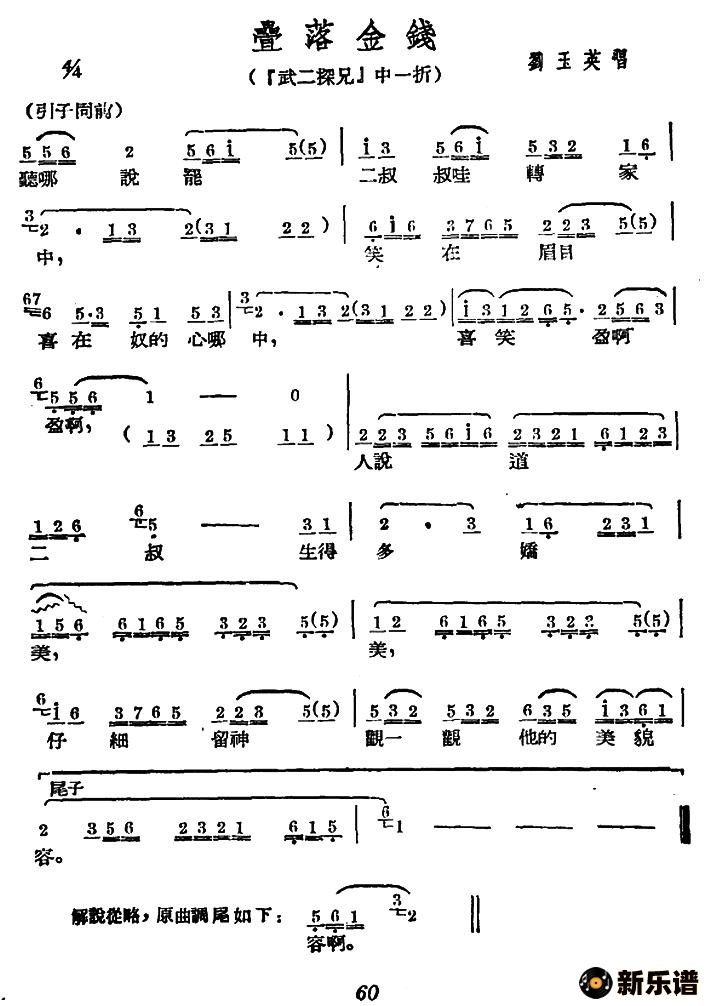 演唱的[广西文场]叠落金钱(《武二探兄》选段)歌词,[广西文场]叠落金钱(《武二探兄》选段)简谱.
