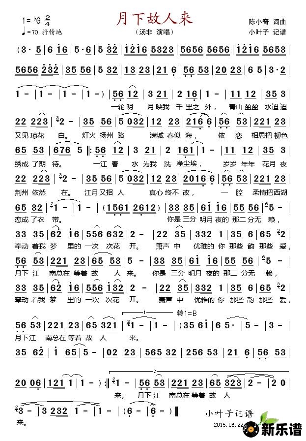 汤非演唱的月下故人来歌词,月下故人来简谱.