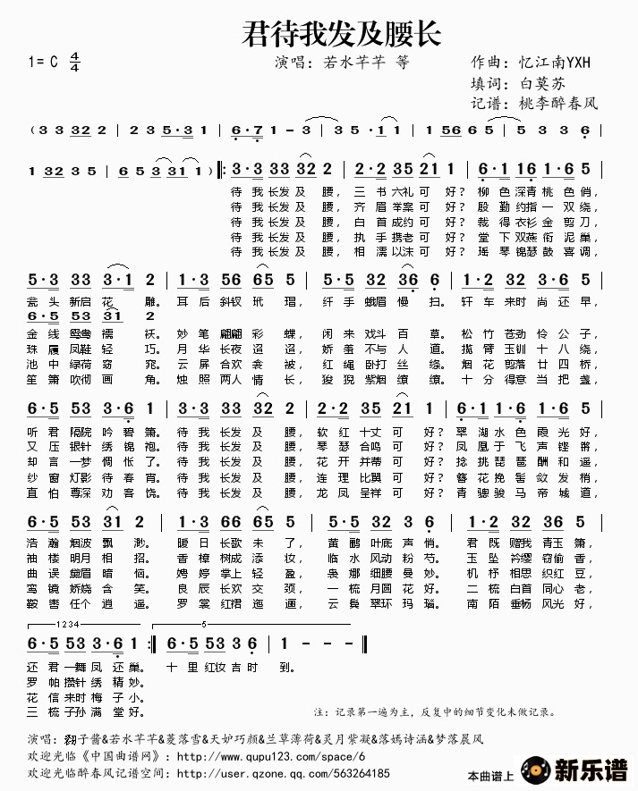 若水芊芊演唱的君待我发及腰长歌词,君待我发及腰长简谱.