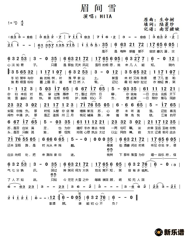 HITA演唱的眉间雪歌词,眉间雪简谱.