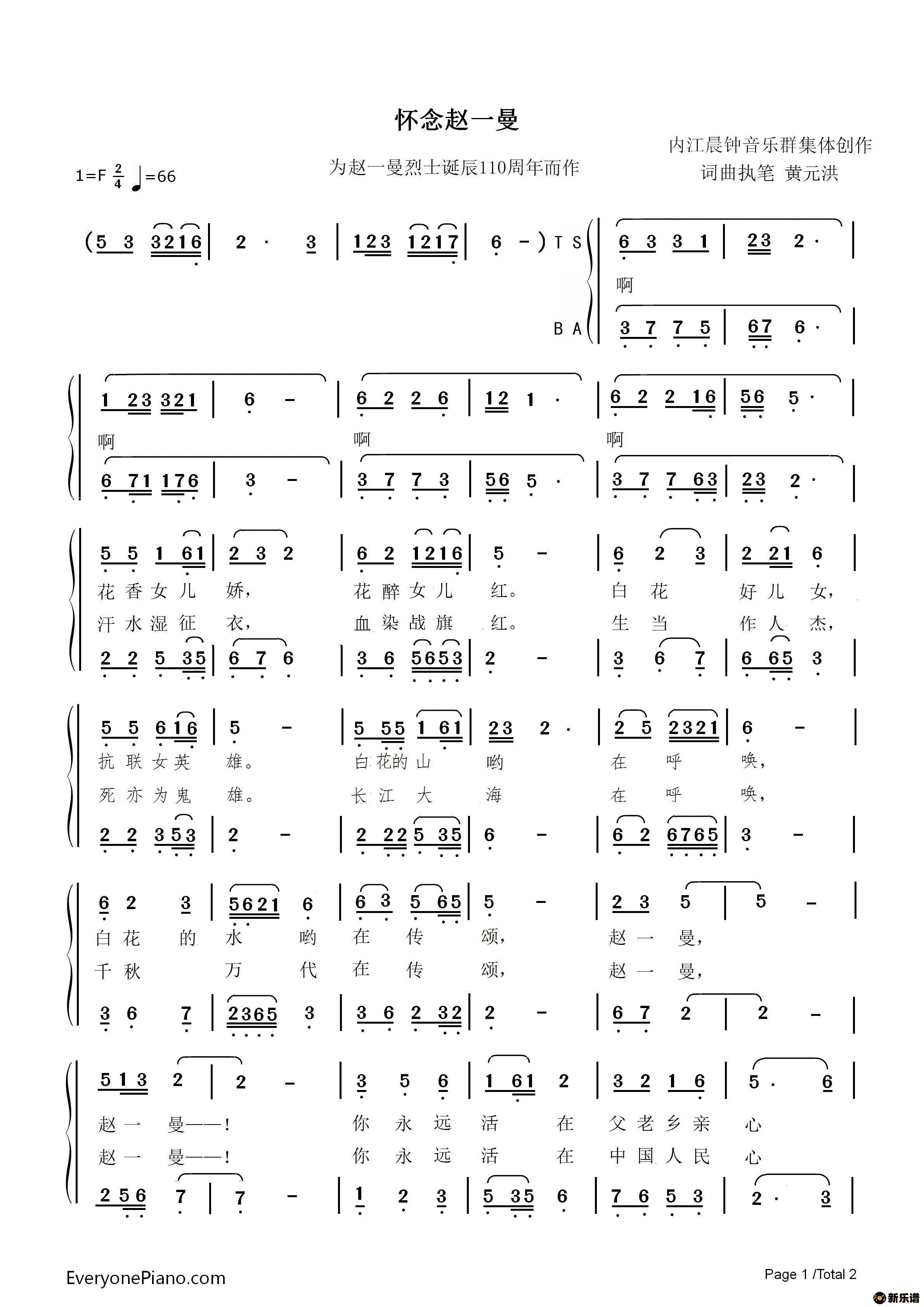 黄元洪演唱的怀念赵一曼歌词,怀念赵一曼简谱.