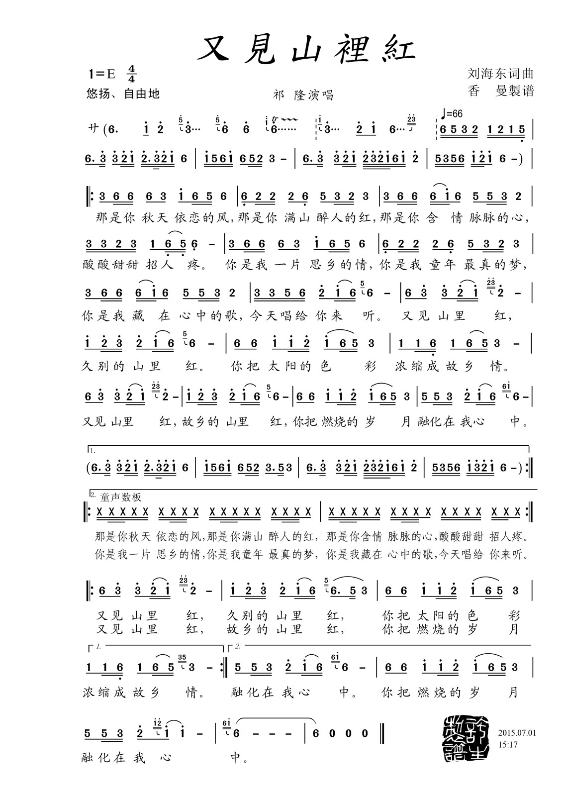 祁隆演唱的又见山里红歌词,又见山里红简谱.