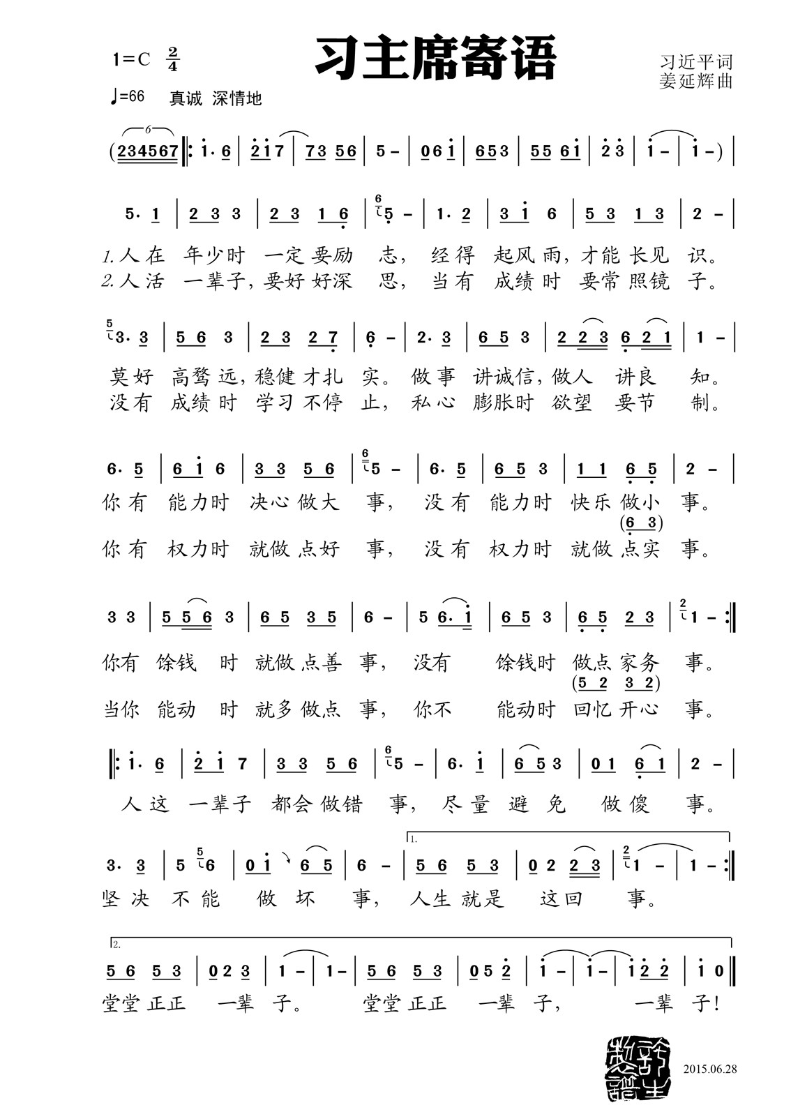 演唱的习主席寄语歌词,习主席寄语简谱.