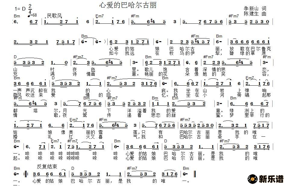 演唱的心爱的巴哈尔古丽(季新山词 陈建生曲)歌词,心爱的巴哈尔古丽(季新山词 陈建生曲)简谱.