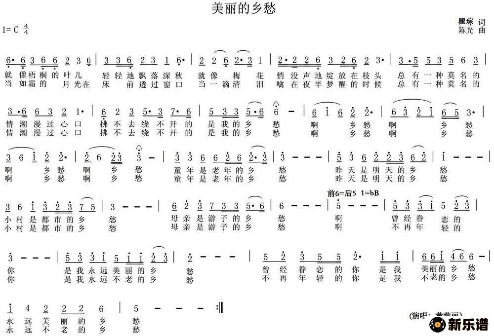 陈光演唱的美丽的乡愁歌词,美丽的乡愁简谱.