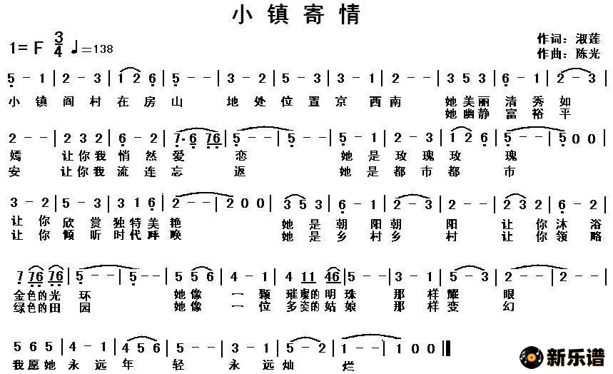 陈光演唱的小镇寄情歌词,小镇寄情简谱.