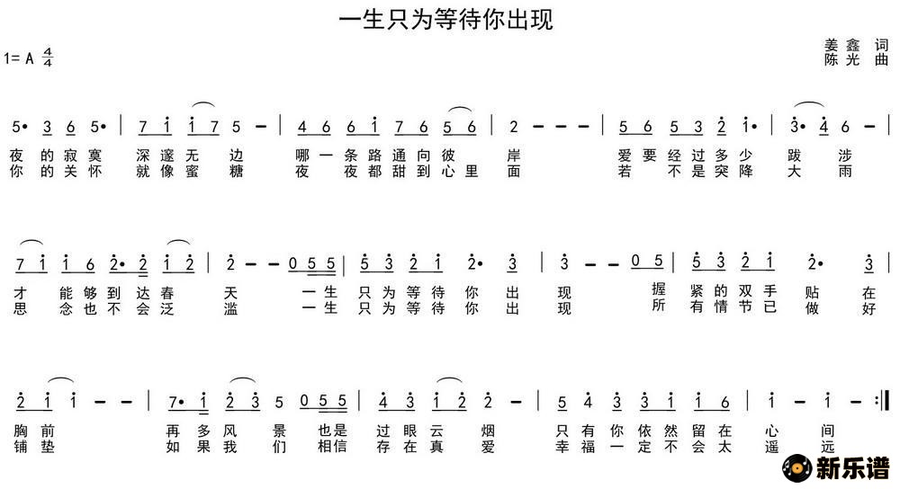 陈光演唱的一生只为等待你出现歌词,一生只为等待你出现简谱.
