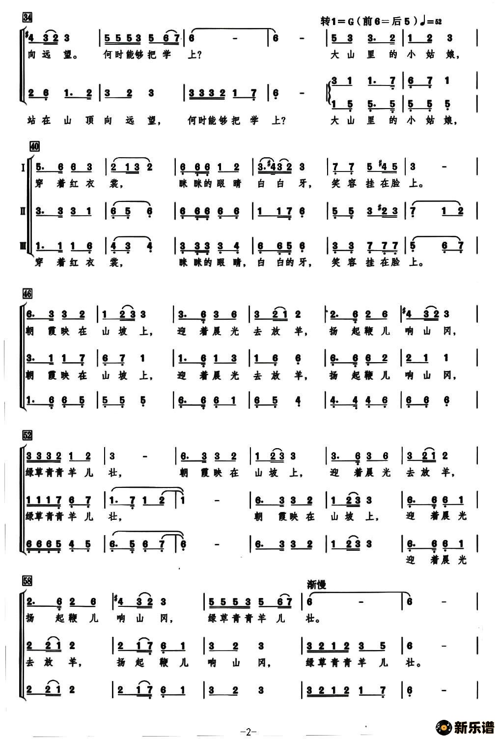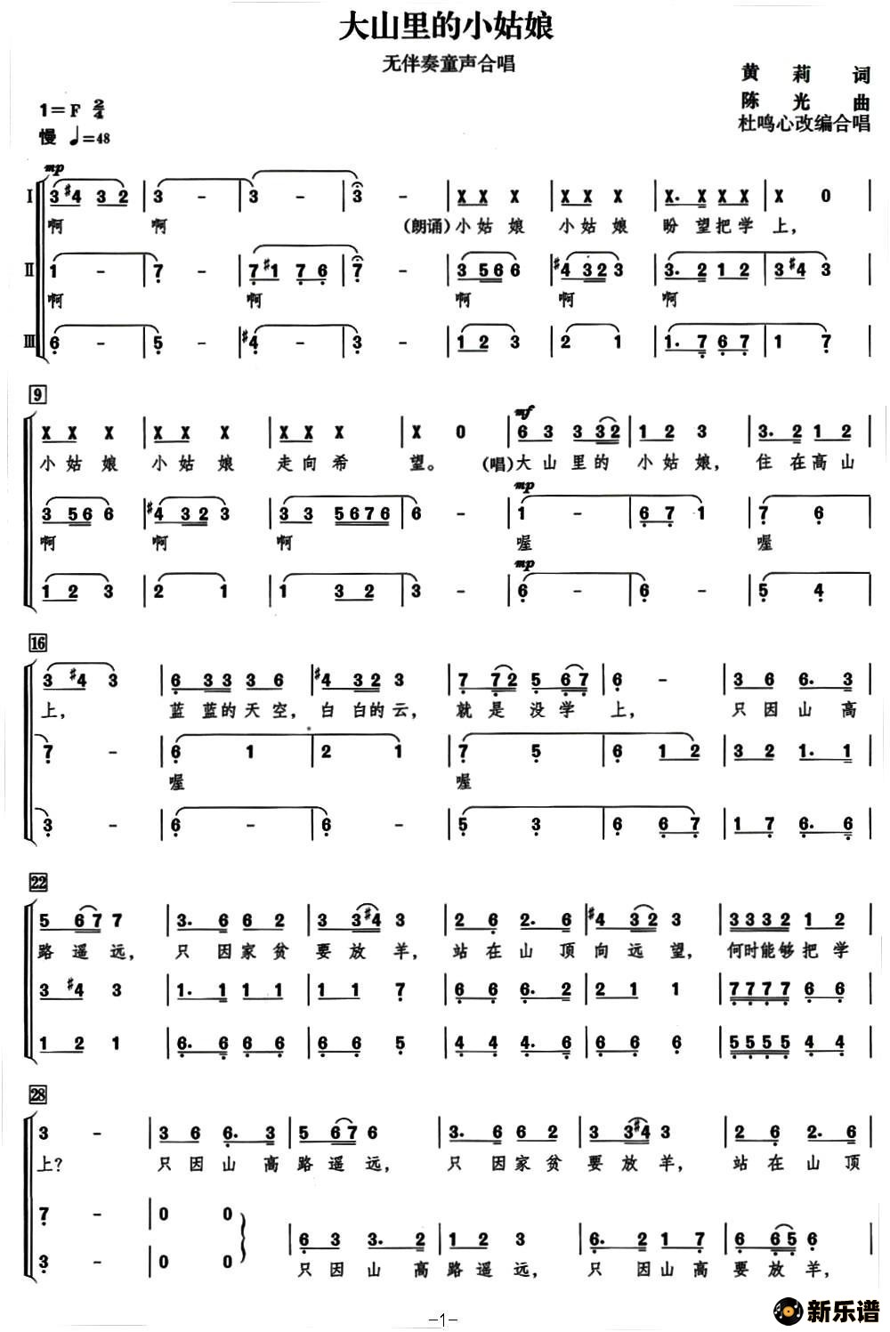 演唱的大山里的小姑娘(黄莉词 陈光曲、杜鸣心改编合唱曲)歌词,大山里的小姑娘(黄莉词 陈光曲、杜鸣心改编合唱曲)简谱.