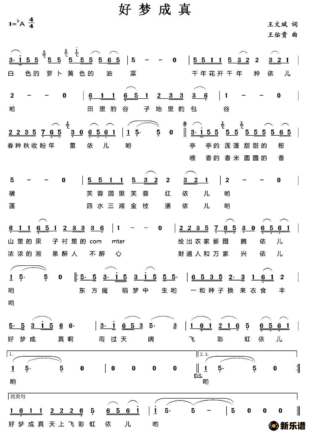 王佑贵演唱的好梦成真歌词,好梦成真简谱.