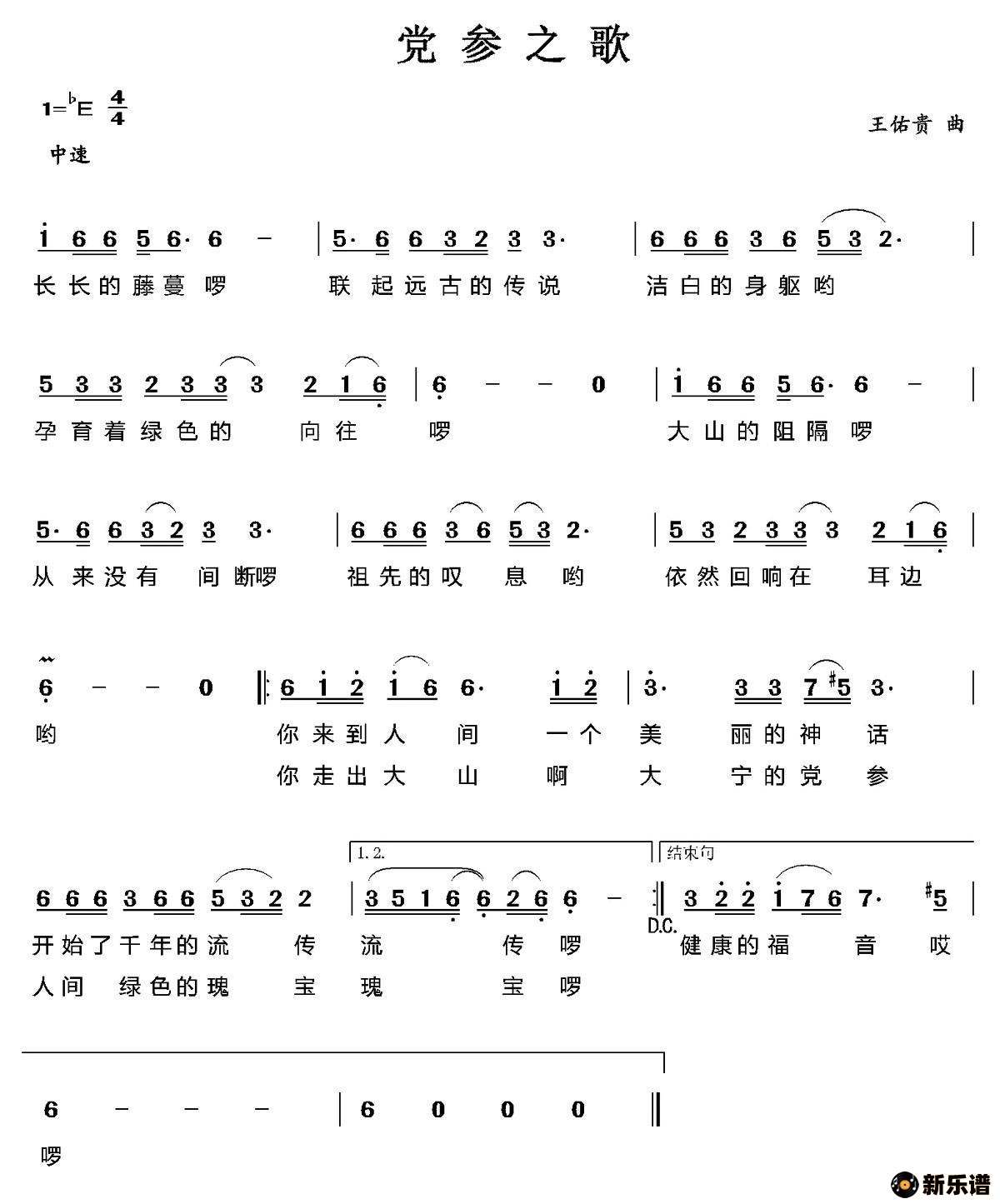 王佑贵演唱的党参之歌歌词,党参之歌简谱.
