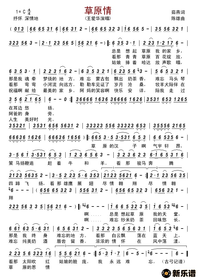 王爱华演唱的草原情(王爱华)歌词,草原情(王爱华)简谱.