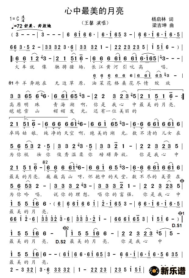 王馨演唱的心中最美的月亮歌词,心中最美的月亮简谱.