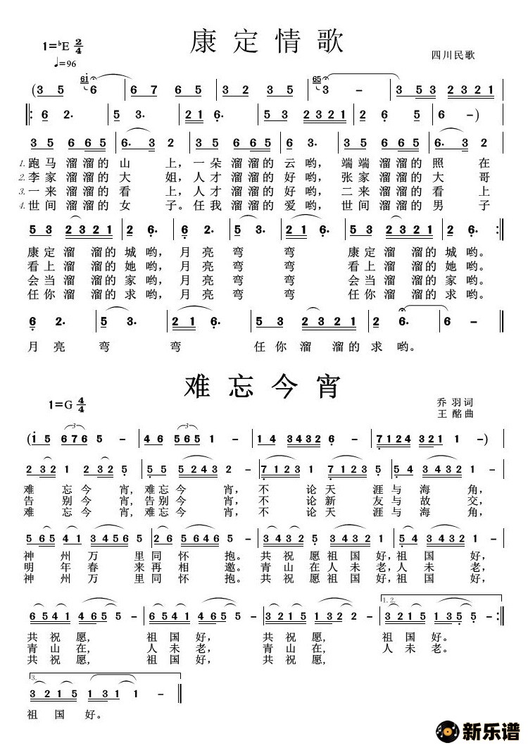 演唱的康定情歌、难忘今宵歌词,康定情歌、难忘今宵简谱.