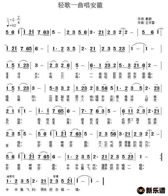 演唱的轻歌一曲唱安徽(戴靓词 王作雷曲)歌词,轻歌一曲唱安徽(戴靓词 王作雷曲)简谱.