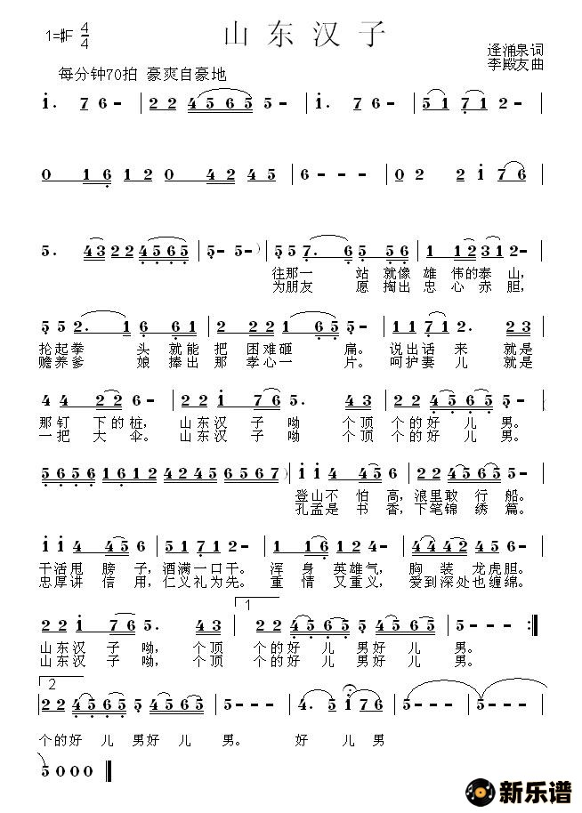 演唱的山东汉子(逄涌泉词 李殿友曲)歌词,山东汉子(逄涌泉词 李殿友曲)简谱.